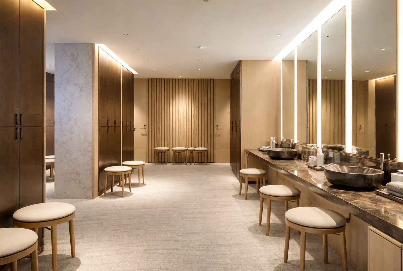 設計以「自然·而然」為主軸,運用溫潤木質、細緻石材與柔和光影,搭配圓形天井導入自然天光,讓光、水、樹影在空間中自然流動,形塑出宛如高端飯店般的靜謐氛圍。